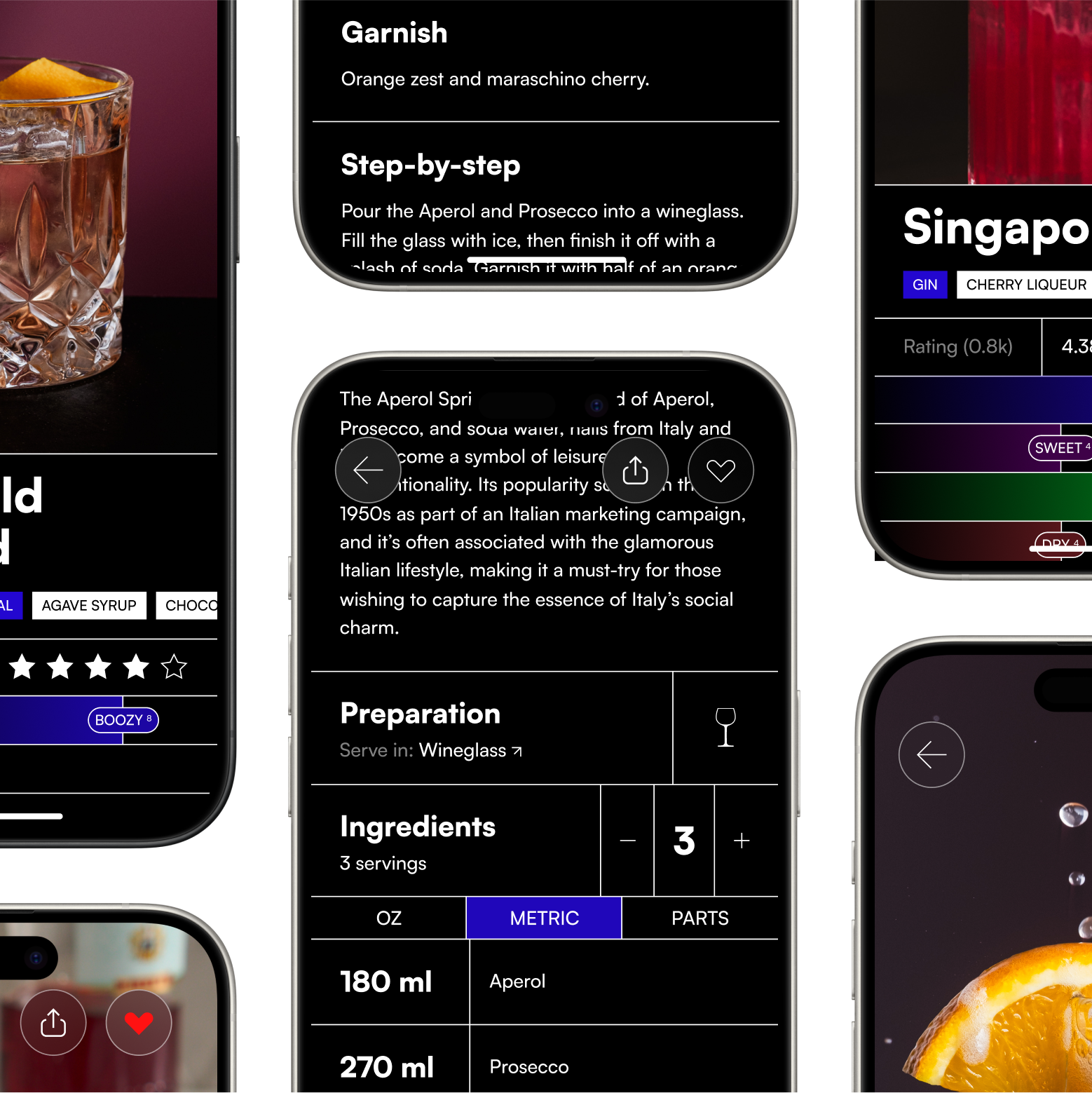 Our recipe screens are more than just instructions. Each cocktail comes alive with a beautiful serving suggestion, and a captivating history lesson.